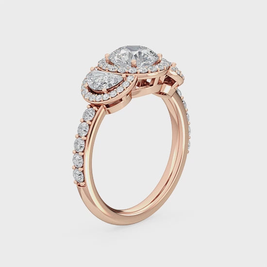 Denna förlovningsring i 18K roséguld utstrålar lyx med sin briljanta centerdiamant på 1,06 karat. Omgiven av flera små labbodlade diamanter och två halvmåneformade diamanter skapar denna ring en hisnande kombination av briljans och elegans. Med en total karatvikt på 2,04 karat är detta smycke både ett uttryck för stil och hållbarhet. Diamanterna i FG-färg och VS1-klarhet säkerställer gnistrande klarhet, perfekt för den moderna kvinnan som vill ha en etisk och prisvärd förlovningsring. Finns även i 10K och 14K roséguld.